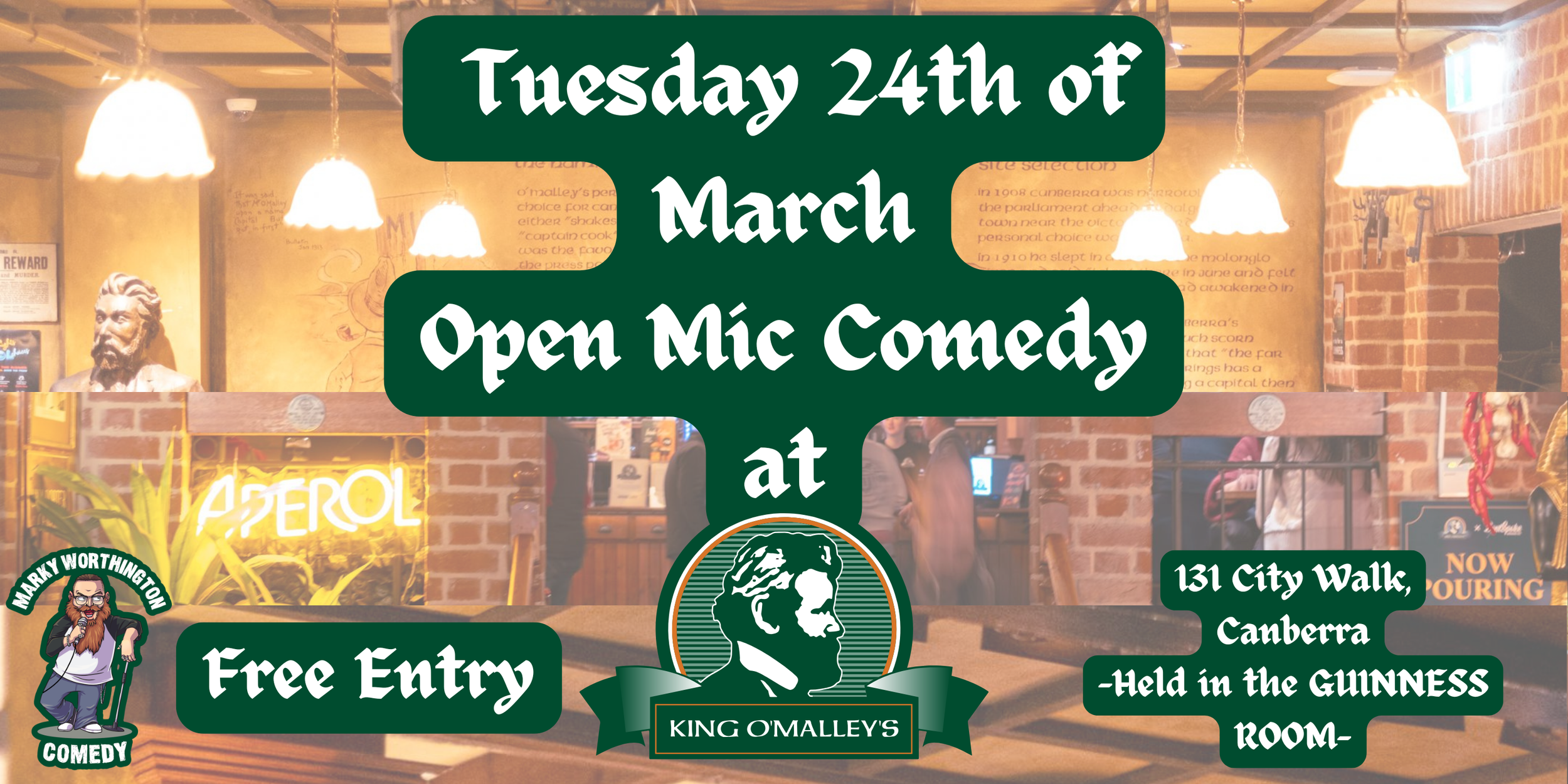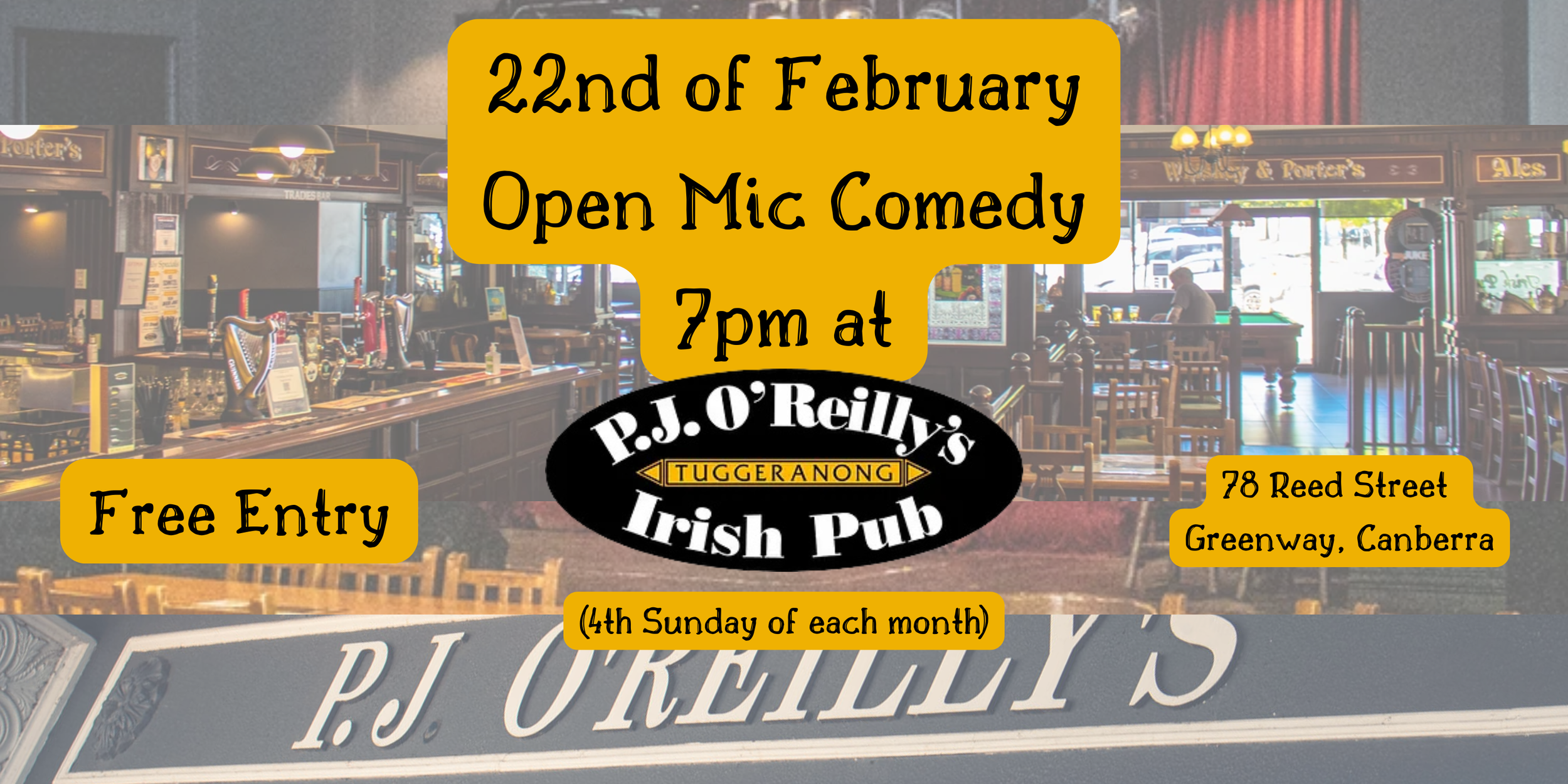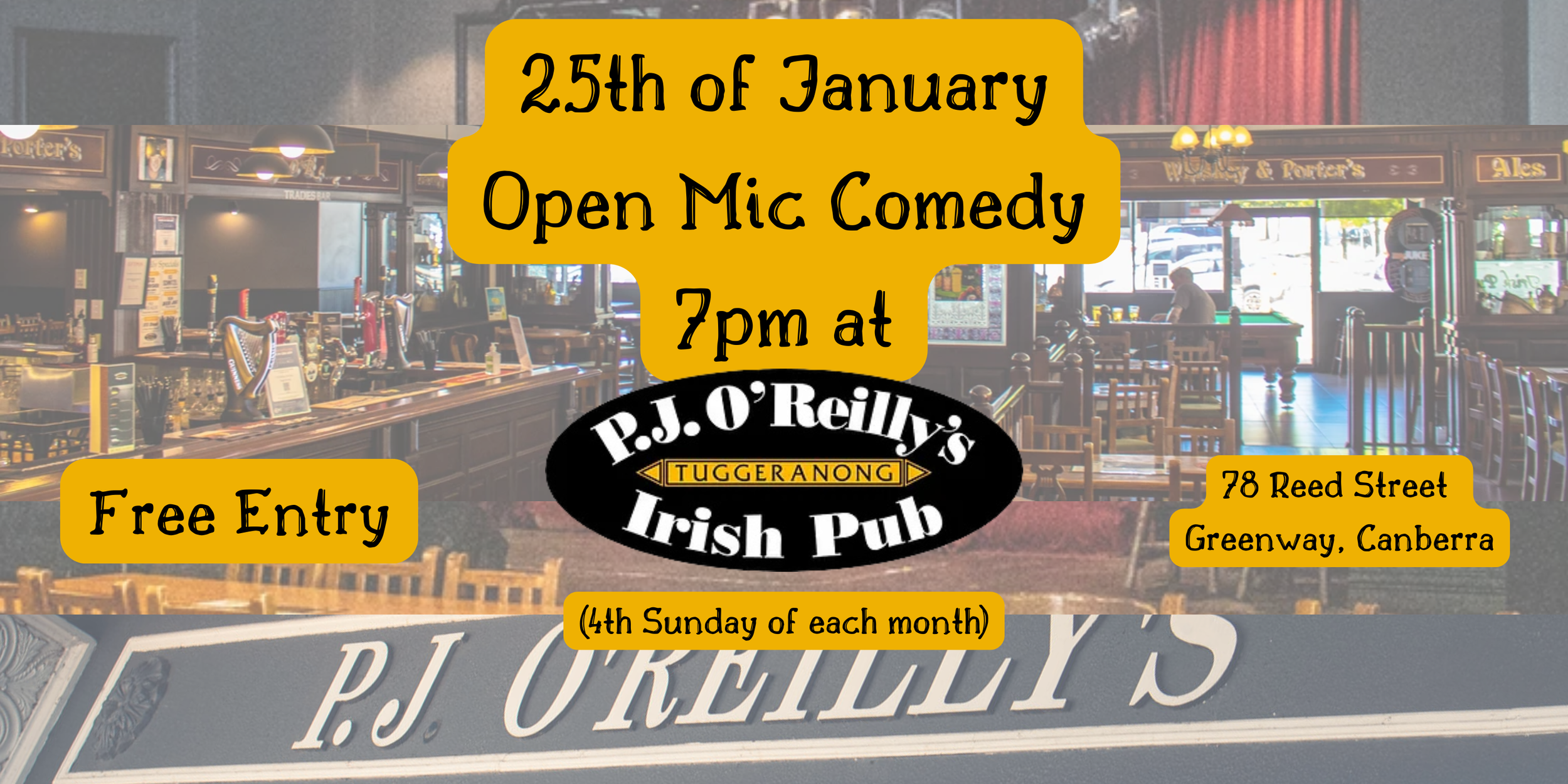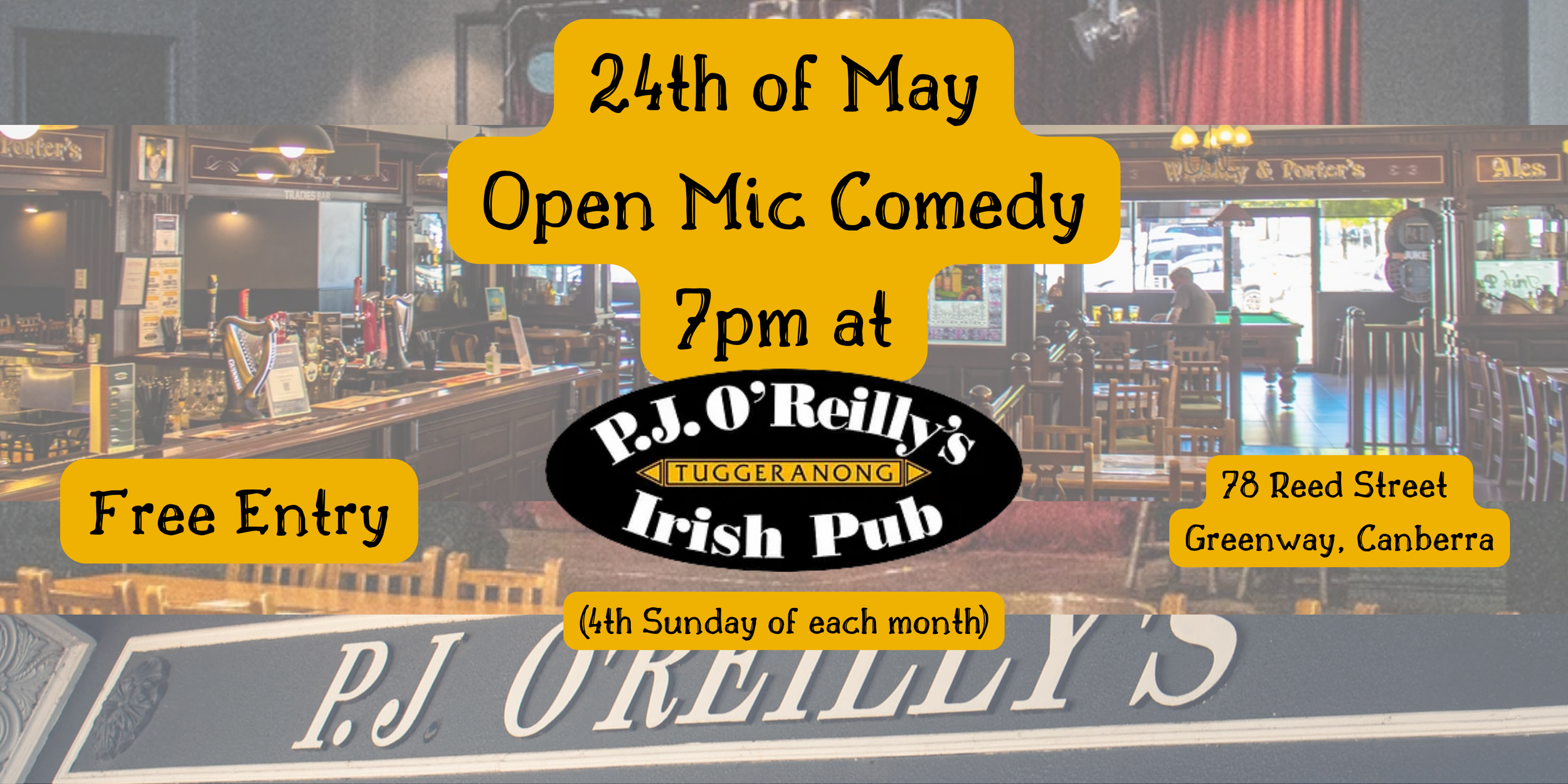 Come along to the next Free Entry Open Mic Comedy night held at PJ O'Reilly's Tuggeranong, head on in grab some great food, a drink and settle in for a night of Comedy in a welcoming pub setting ether in a group or riding solo.